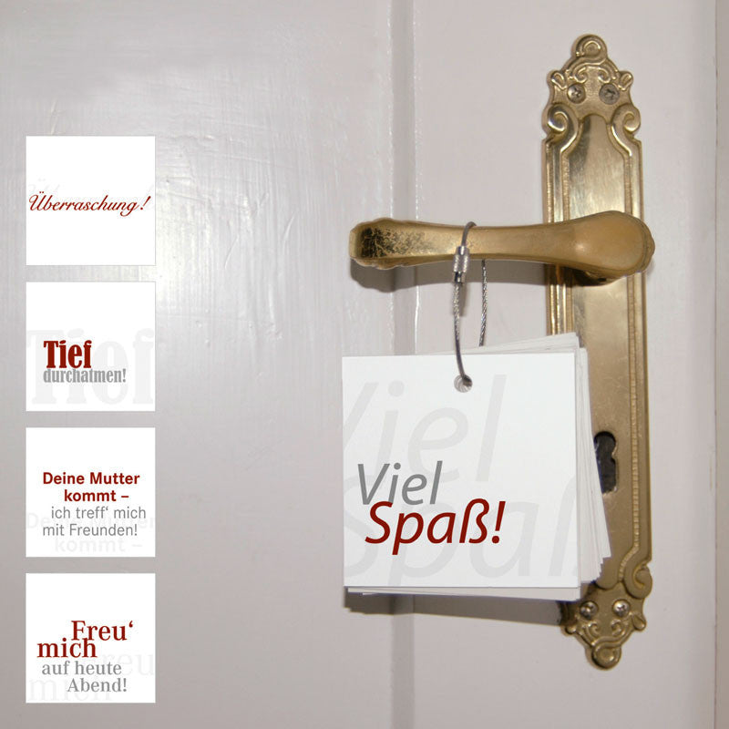 Unsere Kunden lieben sie als kleine sinnfällige Zugabe zum Geldgeschenk bei Hochzeiten. Aber warum nicht auch in der Langzeitpartnerschaft den geliebten Menschen mit kleinen Botschaften am Türgriff überraschen? Raumgestalt aus dem Schwarzwald liefert mit seinen TürBotschaften 50 Kärtchen (8 x 8 cm) aus hochwertigem Karton, auf denen all die netten kleinen Dinge zu finden sind, die man sich gerne zum Abschied sagt: "Freue mich auf heute Abend", "Dicker Kuss", "Überraschung". Außerdem gibt es ein paar unbeschriebene Kärtchen, für die ganz persönlichen Worte, die sonst niemandem einfallen würden. Die Karten sind auf einen stabilen Ring gefädelt und im hübschen Karton verpackt.