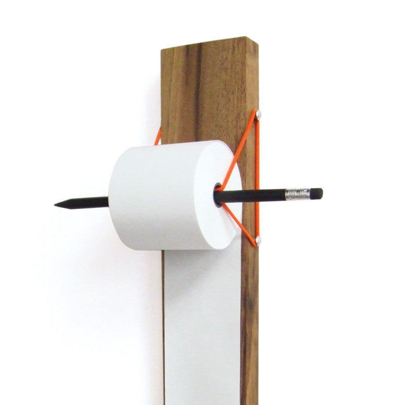 Früher hingen sie an jeder Küchenwand, die abrollbaren Notizzettel für Einkäufe und andere wichtige Erledigungen. Der Wiesbadener Designer und Innenarchitekt Ulf Seydell hat sie sich zum Vorbild genommen und eine bestechend schlichte, moderne Variante daraus geschaffen. 40 Meter "Denkzettel" zum Mitnehmen! Durch den integrierten Stiftehalter ist das Schreibgerät immer an Ort und Stelle. Das Gummiband drückt die Rolle auch beim "Abnehmen" an, so dass kein lästiges Abrollen mehr vorkommt! Zudem ist der Denkzettel (6 x 35 cm) mit zwei Einhängebeschlägen fest an der Wand fixiert, so dass nichts mehr wackelt. Der Denkzettel kann somit mühelos mit einer Hand bedient werden! In Vollholz mit Abreißschiene aus Edelstahl, Papierrolle und Gummiband in Orange. Lieferung in schöner Geschenkverpackung aus Mikrowellpappe.