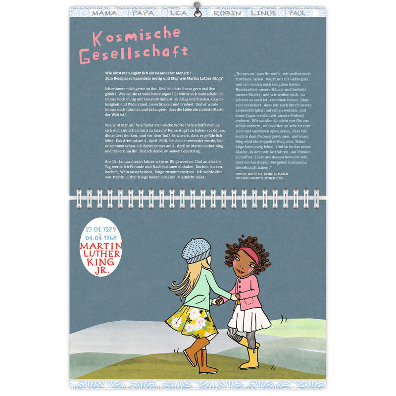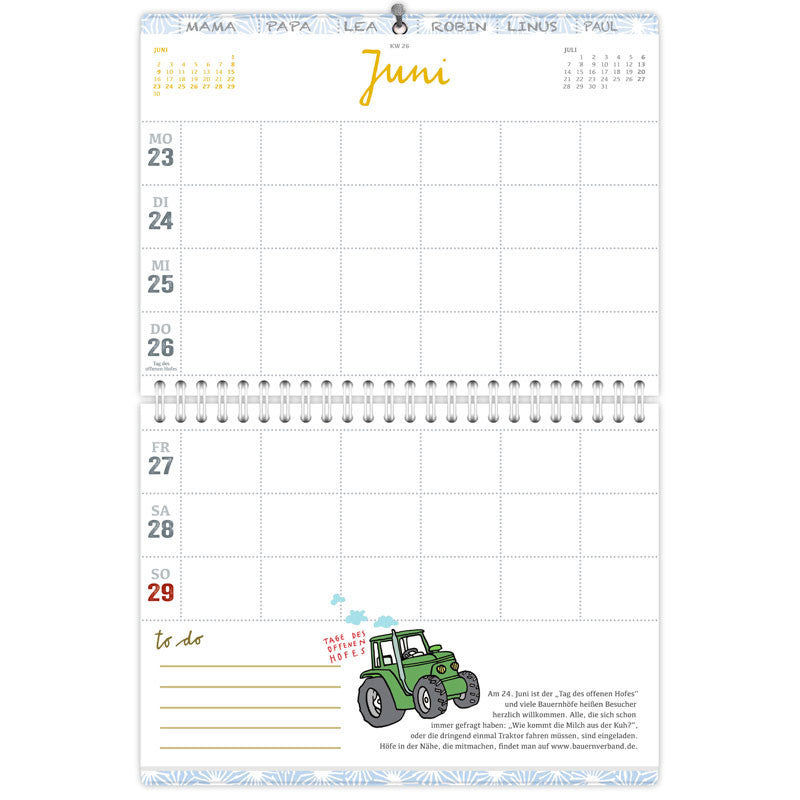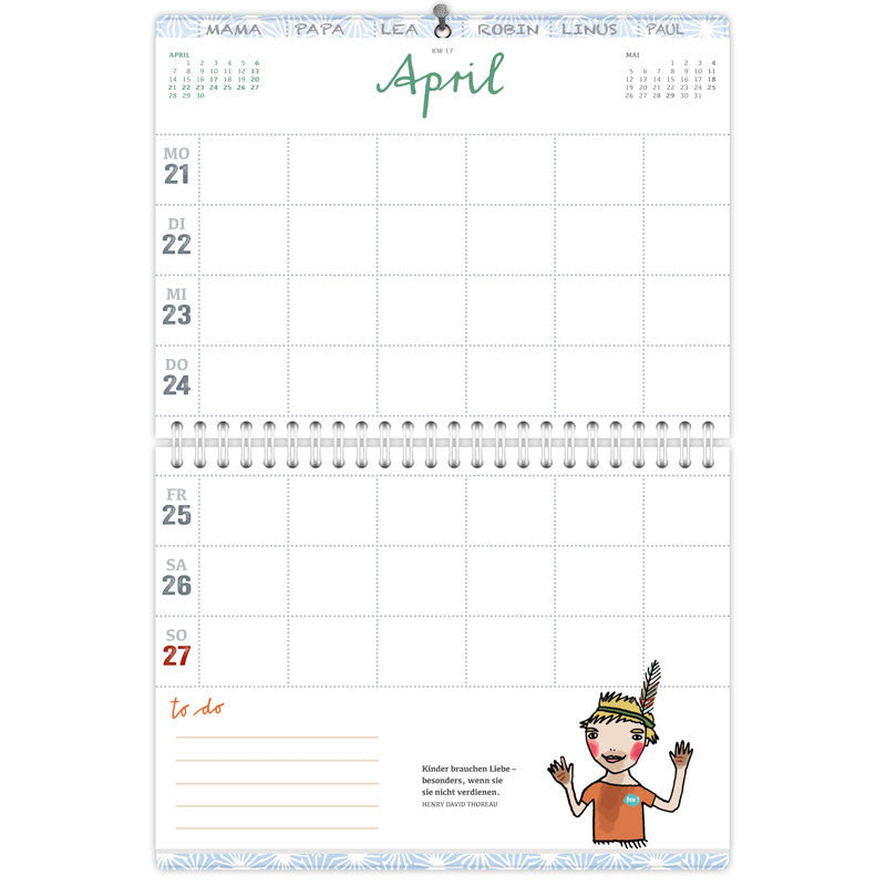 Praktisch, weil er mitgenommen und an die Wand gehängt werden kannDoppelseite für jede Kalenderwoche für bis zu sechs Personen