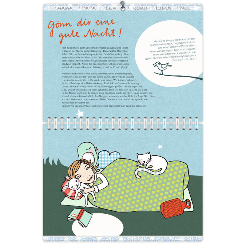 Für die Wand und für die Hand: Der vergissmeinnicht Familienkalender 2014 der Neukirchener Verlagsgesellschaft ist ein wahres Organisationswunder und charmanter Alltagsbegleiter für Familien bis zu sechs Personen. Mit dem spiralgebundenen und patentierten Familienkalender vergissmeinnicht lässt sich auch die stressigste Woche übersichtlich planen und organisieren. Und das Beste ist: Geht es auf den Elternabend oder zum Arzt, kann der Kalender zwecks weiterer Terminplanung einfach von der Wand geholt und in die Tasche gesteckt werden. Auch dort macht er eine gute und höchst praktische Figur. Separate Spalten listen nebeneinander die Aktivitäten der einzelnen Familienmitglieder auf. Neu ist die Aufteilung der Kalenderseiten mit breiteren Spalten. Die bieten nun mehr Platz für Eintragungen und enthalten zusätzlich eine To-do-Liste. Besondere Anlässe wie Geburtstag oder Ferienanfang und -ende werden mit den neuen Stickern markiert. Darüber hinaus gibt es Stundenpläne, Checklisten, schöne Anregungen zu den Jahreszeiten und Feiertagen plus ein Gummiband zum Verschließen. Abgerundet wird der vergissmeinnicht-Familienkalender der Neukirchener Verlagsgesellschaft von den vielen, liebevoll gestalteten Illustrationen und informativen Texten, die das Bild des unverzichtbaren Organisationstalents für die ganze Familie komplettieren. Blau mit weißen Blumen. 144 Seiten im Format 21 x 14,8 cm. Kalendarium von Januar 2014 bis Dezember 2014.
