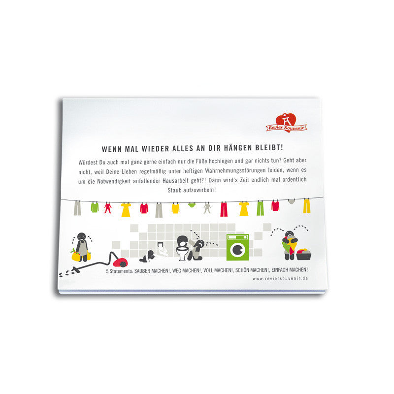Bleibt dir gerade die Spucke weg, weil die Spülmaschine mal wieder nicht ausgeräumt, dein Auto zugeparkt und durch stundenlange Diskussionen am Arbeitsplatz der Kaffee kalt geworden ist? Zeit, sich Luft zu machen! Weil gute Worte aber besonders gerne in der selbigen verpuffen, kleb deinen Mitmenschen deine klare Botschaft am besten gleich an ihre empfindlichste Stelle. Wir empfehlen, die Küchentür, die Windschutzscheibe, den Computerbildschirm. Haftnotizen von Revier Souvenir sind der ideale Überbringer deutlicher Worte. Die Blöcke mit je 50 pfiffigen Klebezetteln (100 x 75 mm) liefern im festen Umschlag passende Statements für ärgerliche Situationen und Menschen mit gestörter Wahrnehmung. In Schutzfolie verpackt. Haftnotizen "Hausputz" für Situationen, in denen mal wieder alles an dir hängen bleibt. Fünf verschiedene Statements: "Sauber machen!", "Weg machen!", "Schön machen!"...