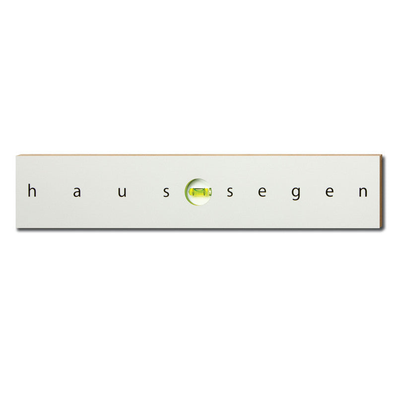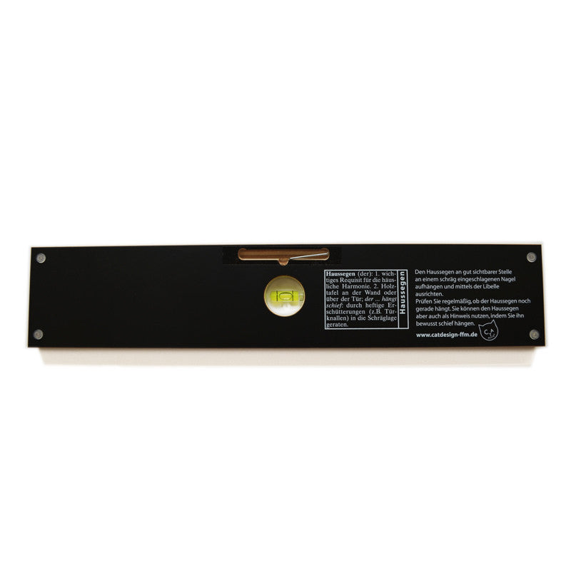 Früher hing in jedem Haus über der Eingangstür eine Holztafel mit guten Segenswünschen: der Haussegen. Wenn nach einem Streit die Tür heftig zugeschlagen wurde, hing der Haussegen schief. Die modere Variante kommt von CATdesign und kombiniert das Wort Haussegen mit einer Wasserwaagenlibelle (430 x 85 x 15 mm). Hängt der Haussegen gerade oder schief an der Wand? Der Besucher jedenfalls ist immer verlässlich über den aktuellen Stand der häuslichen Harmonie informiert. Der Haussegen ist ein geistreiches Geschenk zu Hochzeit, Einzug, Umzug, neuer Liebe - denn er lässt sich immer wieder geraderücken. Die Rückseite ist mit einer Gebrauchsanweisung und vier Gummipuffern ausgestattet. Die halten den Haussegen auch mal schräg an der Wand. Nägel zum Aufhängen sind im Lieferumfang enthalten.