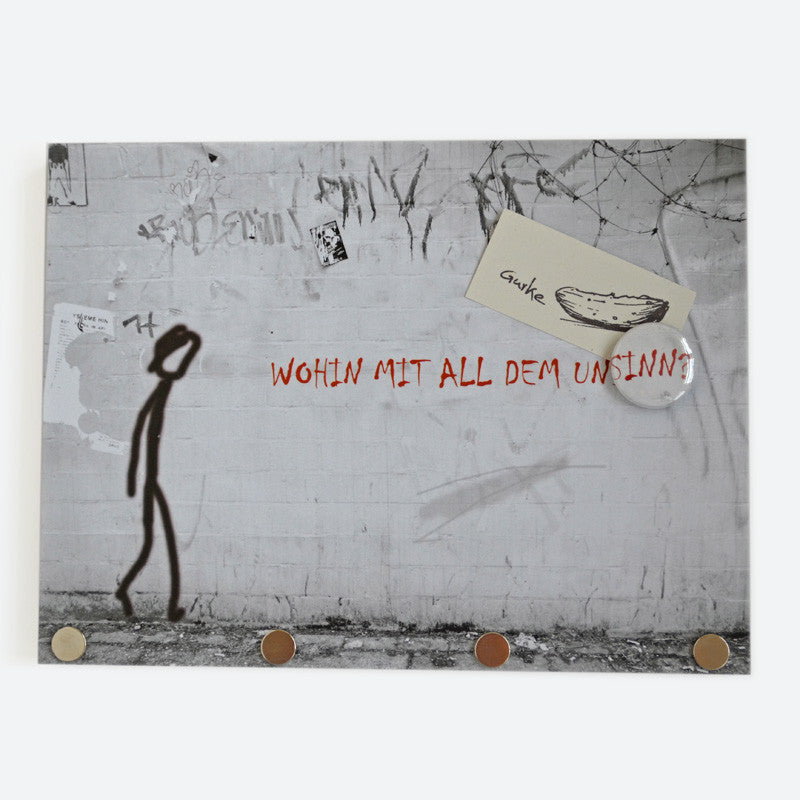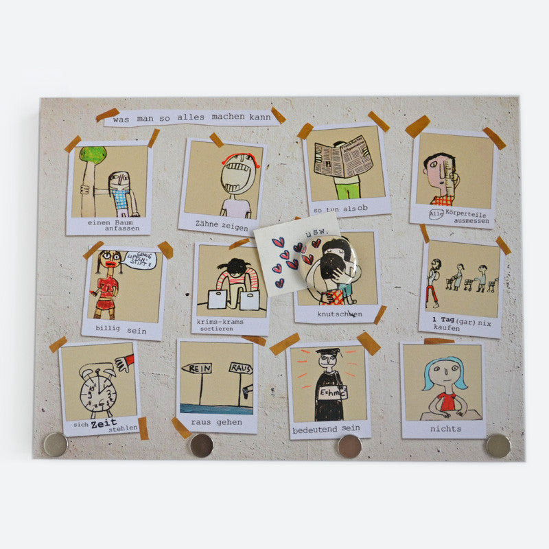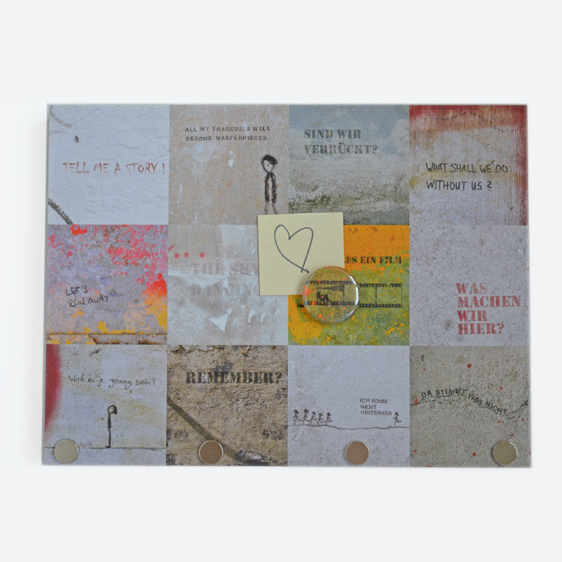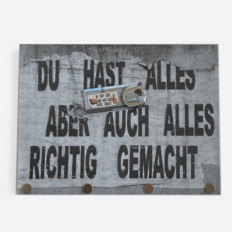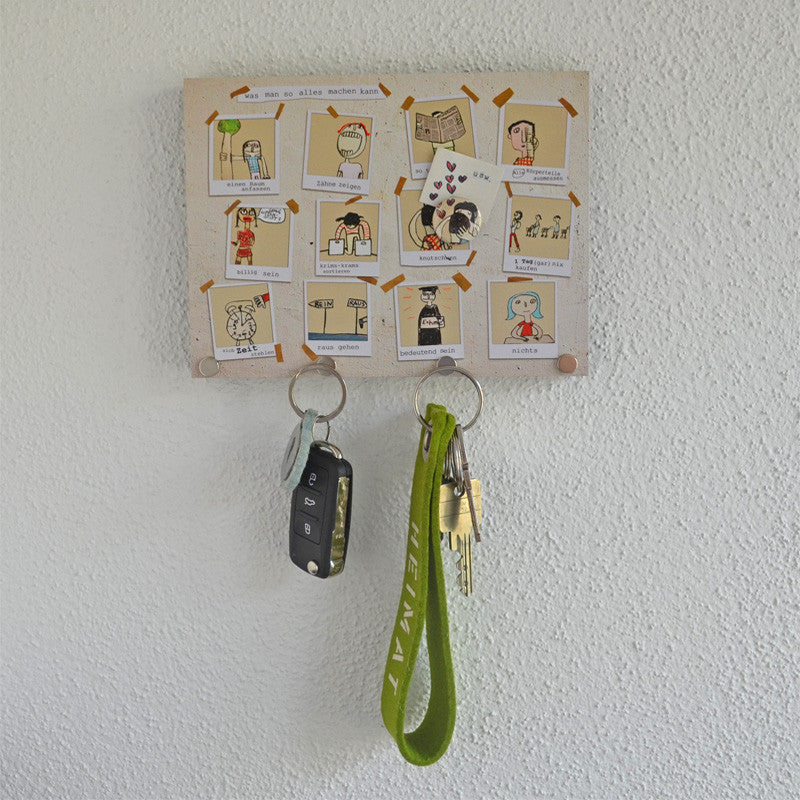 Angefangen hat es mit Collagen aus schönen Motiven, die Kathrin Fischer von Strandgutfischer zu Magnetschlüsselbrettern verarbeitete. Straßenkünstler und Liedermacher wie Gisbert zu Knyphausen lieferten ihr die Inspiration für die 20 x 15 cm großen und rund 1,5 cm starken Magnettafeln mit aufgedrucktem Motiv, die sie auf Hamburg St. Pauli im eigenen Laden fertigt. Das Besondere daran ist, dass nicht nur die gesamte Tafel magnetisch ist, sondern in den unteren Rand drei ultrastarke Magnete eingelassen sind. Die können sogar einen Hammer halten. Wir haben es ausprobiert! Daran hängt dann auch der dickste Schlüsselbund bombensicher fest. Einfach mit zwei Nägeln oder zwei Schrauben an der Wand befestigen. Zu jedem Schlüsselbrett ist eine wunderbare Serie an Magnetbuttons mit Motivausschnitten erhältlich. Ein passender Magnetbutton wird direkt zu jedem Brett mitgeliefert. Weitere können hier bestellt werden. Ein Blick darauf lohnt sich. Oder warum nicht verschiedene Motive collagenhaft mit den Buttons anderer Serien vermischen? Bei Strandgutfischer passt immer alles zusammen, auch wenn es auf den ersten Blick nicht so erscheint. Bei uns erhältlich sind die Modelle "Alles richtig" , "Kreischer", "Geigerin", "Verliebt", "Straßen" und "Unsinn".