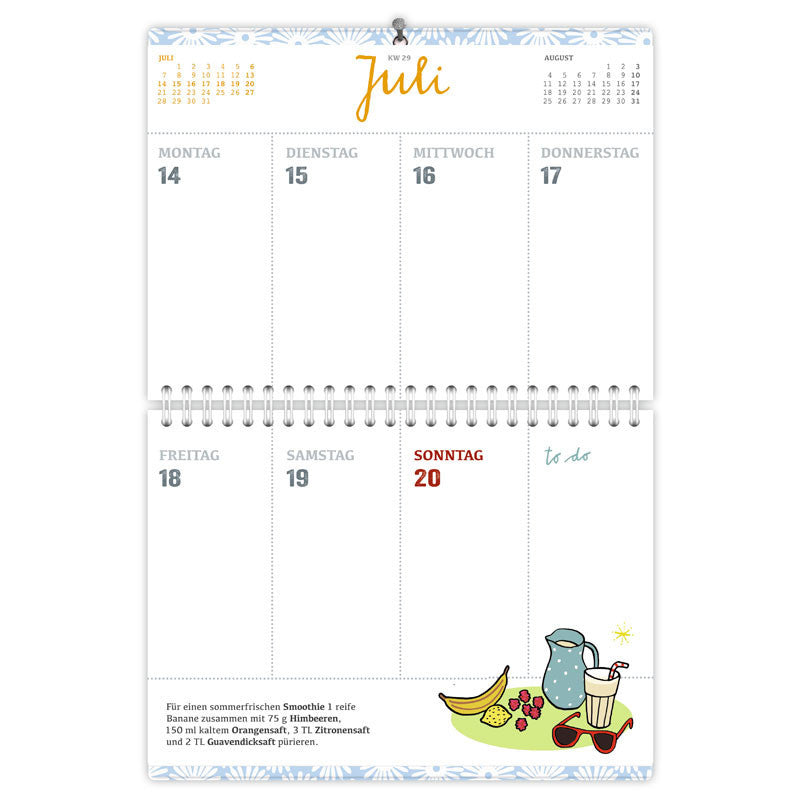 Praktisch, weil er mitgenommen und an die Wand gehängt werden kannDoppelseite für jeder Kalenderwoche und extra To-do-Spalte