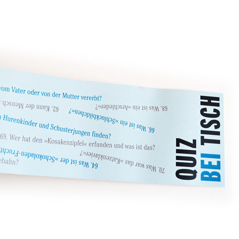 "Quiz bei Tisch" ist eine ganz neue Art des Quizvergnügens. Den Tischläufer mit spielerischem Mehrwert einfach über die Länge des Tisches ausrollen und losspielen. Mit spannenden und unterhaltsamen Fragen aus verschiedenen Themengebieten. Ob zur Tischdekoration oder als Mitbringsel, "Quiz bei Tisch" ist ein einziger Spielgenuss und bringt jede Menge Vergnügen und Gesprächsstoff in die Runde. Die Antworten liegen in einem Lösungsheft bei. Der Tischläufer aus festem Papier garantiert großen Rätselspaß, von der Vorspeise bis zum Nachtisch.