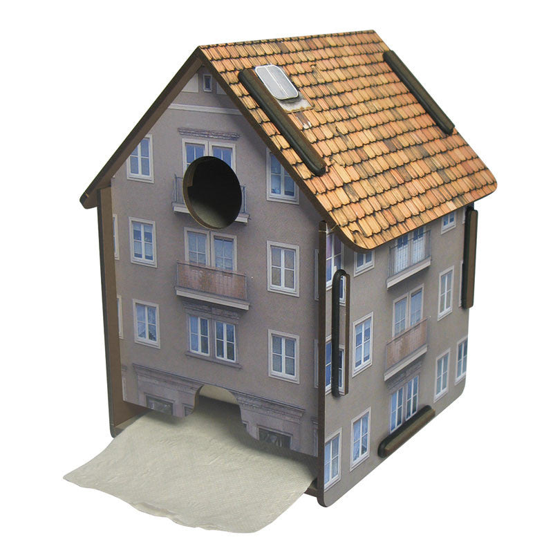 In diesen Hütten lässt sich so einiges abwickeln: Die originellen Halterungen für Toilettenpapier von WERKHAUS sind Blickfang für jedes Örtchen. Schaffen Sie Ihrer Toilettenpapierrolle ein angenehmes eigenes Heim, sie hat es verdient. Denn kaum ein Gegenstand ist bei mehr im Rund-um-die-Uhr-Betrieb eingespannt. Das Toilettenpapierhaus (18 x 14,5 x 14,5 cm) wird aus maßgefertigten Einzelteilen und Gummiringen zusammengesteckt. Bei der Herstellung verwendet WERKHAUS ausschließlich ökologisch unbedenkliche Materialien wie Holz, mitteldichte Faserplatten und Recycling-Papier. WERKHAUS produziert in Deutschland mit behinderten Menschen und Mitarbeitern aus mehr als 12 Nationen. Stabile Holzwerkstoffplatten (MDF) mit hochauflösendem Digitaldruck und Werkhaus-Stecksystem.