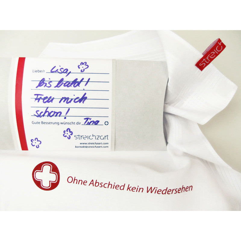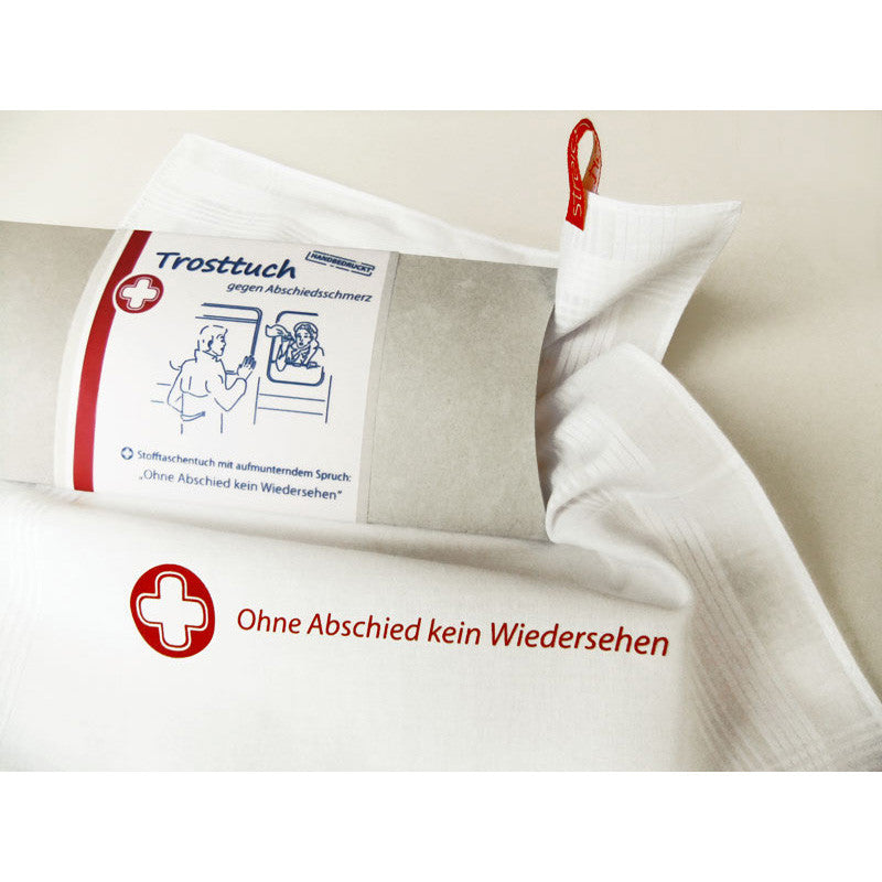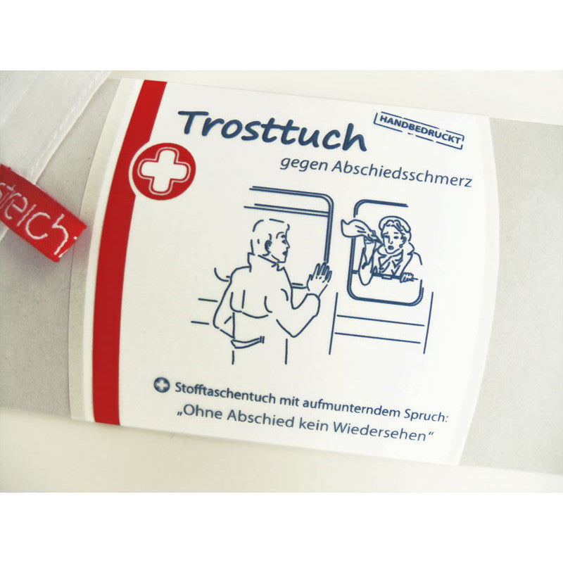 Lange vorbei sind die Kinderzeiten, in denen Mama und die Oma Tränen noch mit einem blütenweißen, gestärkten und bestickten Taschentuch von den Wangen wischten. Wegwerftücher aus Papier haben das sinnliche Taschentuch vergangener Tage längst ersetzt. Wie schön, dass es jetzt die Trosttücher von streichzart gibt. Die mit aufmunternden Sprüchen bedruckten Tücher sollen Trostsuchende in den kleinen und großen Krisen des Lebens wieder ein wenig glücklich stimmen. Die Stofftaschentücher (30 x 30 cm) aus 100 % Baumwolle werden per Hand mit der Siebdruckmaschine bedruckt und im hübschen Graukarton geliefert.