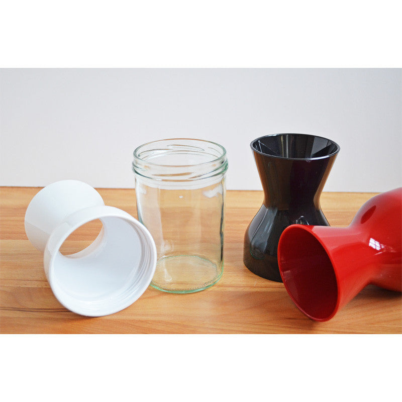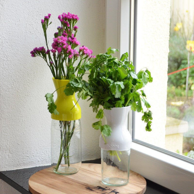 Der Vasenaufsatz Irmi von ODIN steht für eine ganz andere Art des Recyclings, denn IRMI macht aus leeren Gurken-, Honig-, Marmeladen- und anderen Konservengläsern im Handumdrehen fröhliche, bunte Vasen für Blumen und Kräuter. Einfach aufschrauben! IRMI passt auf alle Gläser mit Twist-Off-82-Verschluss. Und davon gibt es in jedem Haushalt viel mehr als vermutet. Garantiert!
